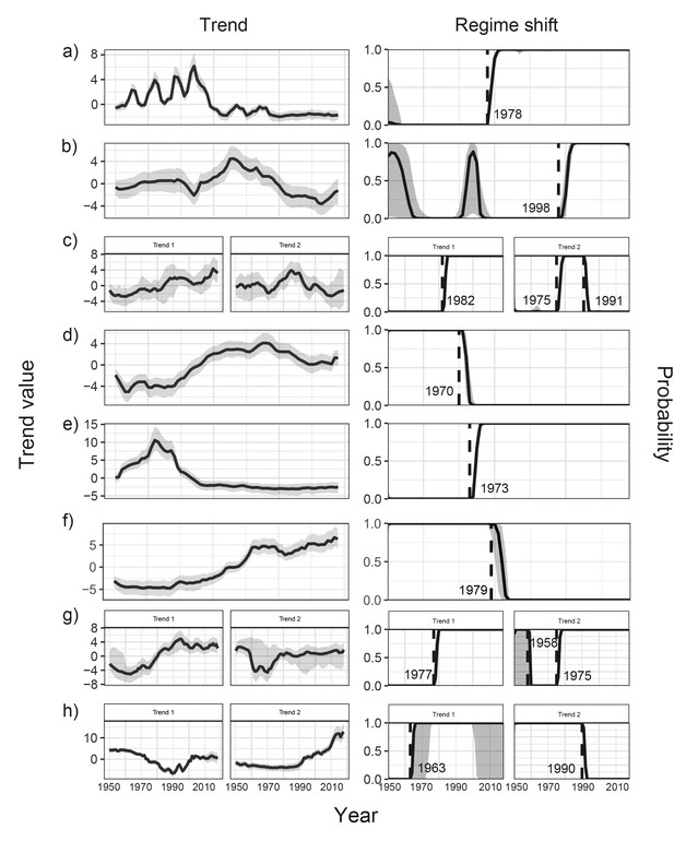 图1北极八个大海洋生态系的长期变动及跃变情况。(a)-(h)分别表示巴伦支海、格陵兰海、挪威海、冰岛海、西格陵兰海、楚科奇海、东白令海和西白令海 LME。