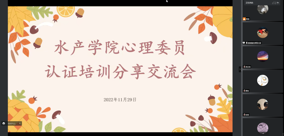 为提高学院心理健康朋辈队伍成员助人、自助、互助能力,进一步加强心理健康教育工作,学院组织51名心理健康朋辈队伍成员参与全国高校心理委员认证培训。参加培训的本科生班级心理委员、宿舍长、心理健康协会成员以及研究生实验室心理气象员,他们认真完成培训课程,顺利通过培训考核。11月29日晚,培训班成员齐聚一堂,线上开展本次培训的学习心得分享交流会,花椒直播 辅导员韩旭出席本次交流会。交流会上气氛融洽,同学们积极分享自己的感悟与心得,碰撞出思想的火花,促进了学院本硕博间、班级间的沟通交流,把学院心理健康朋辈队伍拧成一股绳。
