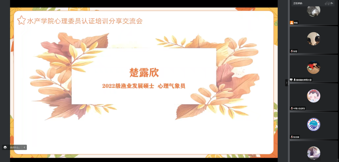 甲壳动物实验室心理气象员2022级硕士王茹从自己切身感受出发,谈到了研究生阶段可能会遇到的诸多问题,基于此提出了研究生如何以实验室为单位开展心理工作,如积极开展调研活动、创新活动形式等,同时王茹同学也为大家普及了心理学中的“焦点效应”知识。最后一位是2022级渔业发展硕士楚露欣,她从拥有健康的心态、拥有共情能力、注重对方隐私以及具有心理专业知识几个角度提出了一位优秀心理委员所应具备的能力。