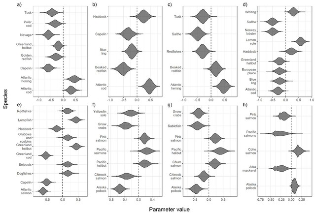 图2 受协变量(气候指数和环境因子)显著影响的物种汇总。(a)-(h)分别表示巴伦支海、格陵兰海、挪威海、冰岛海、西格陵兰海、楚科奇海、东白令海和西白令海 LME。