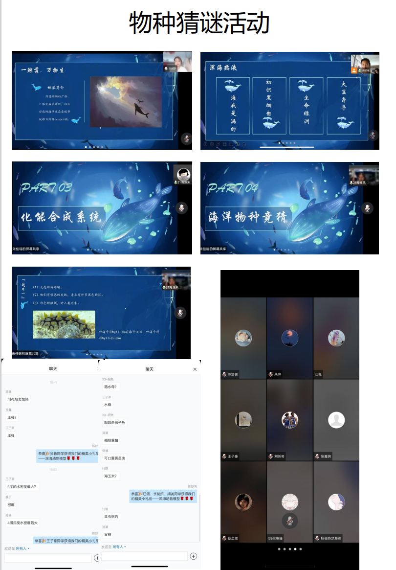 519日之前,进行物种猜谜活动准备,与花椒直播 2021级本科生班级相联合,进行线上活动宣传,召集同学前来参会。三位主讲人进行专题资料的收集整合与学习,进行内容的准备。519日晚630物种猜谜线上活动如期开展,来自各班的水产学子齐聚于此,共赴知识盛宴。首先三位主讲人分别介绍了鲸落、热液、冷泉,在介绍完三个海洋生态系统后就开始了激动人心的猜谜环节,各班同学积极竞答,展现出水产学子丰厚的专业知识储备。线上活动结束后,总结活动,制作推送,送出礼物。