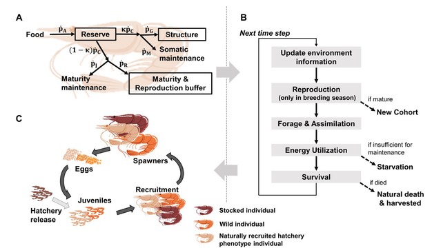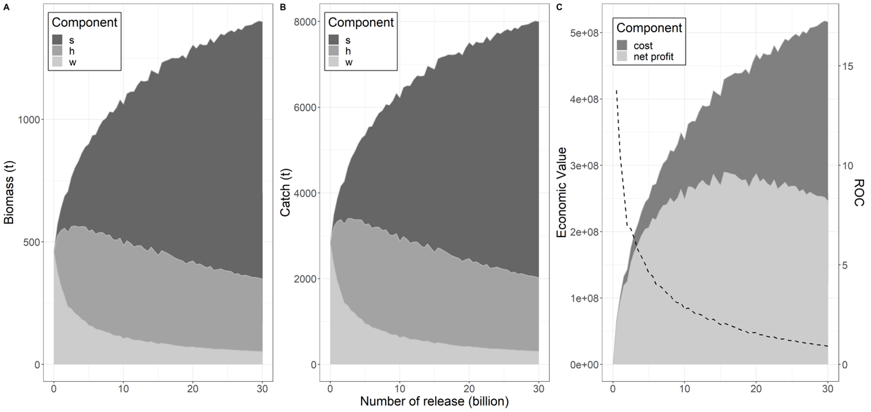 本研究开发了一个基于动态能量收支理论的基于个体的模型(DEB-IBM),以理解增殖种群动态和密度制约机制将其应用于典型增殖物种中国对虾(Fenneropenaeus chinensis)以证明该模型框架的效用模型预测符合实际观测的种群生物量和产量轨迹。针对资源增殖的多重效应,本研究阐明了由于密度制约效应,生物量和产量的增加随放流规模的增加而受到抑制,以及生态和经济目标之间的权衡,即追求高经济效益可能会在没有适当管理的情况下损害野生种群。此外,本研究揭示了结合资源增殖和捕捞控制在促进种群恢复和维持产量方面的潜力,并强调了理解资源增殖中密度制约效应的重要性,并提出了评估资源增殖种群动态的方法,在制定增殖管理策略方面具有巨大潜力。该方法可作为评估资源增殖动力学的一般性方法,为增殖渔业的管理提供参考依据,对于我国海洋牧场的合理规划和科学建设具有重要的应用价值。