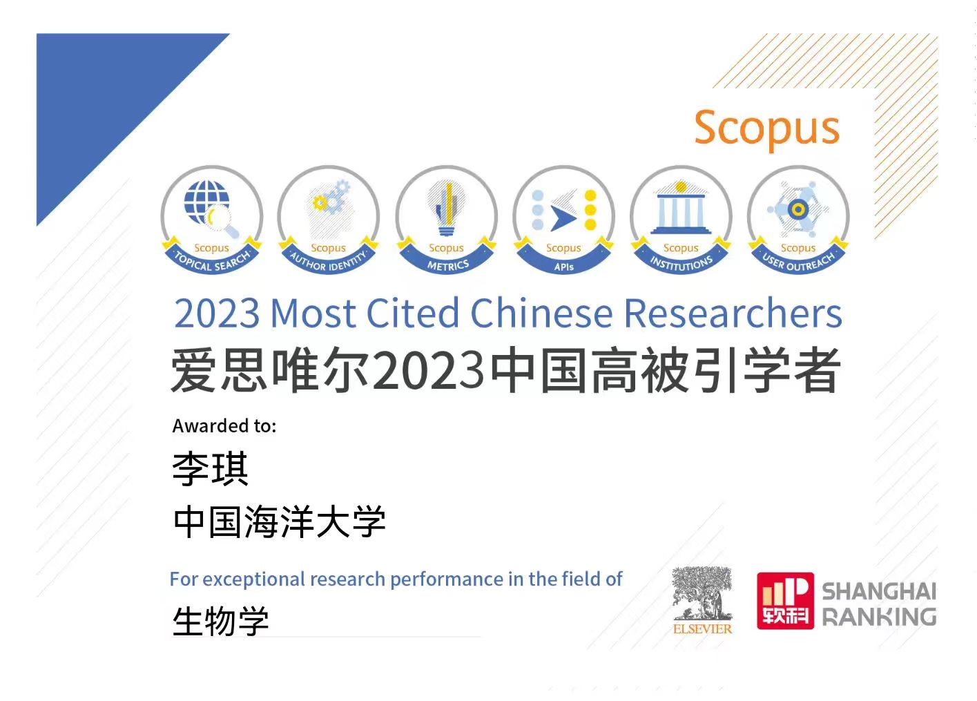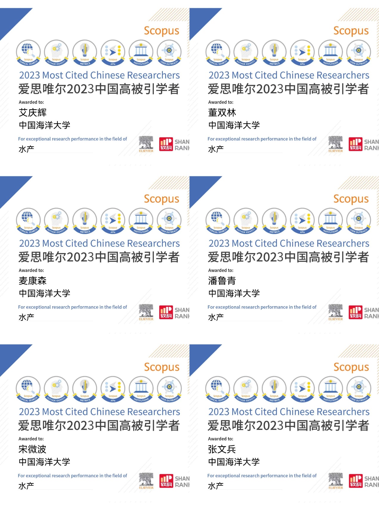 近日,全球性信息分析公司爱思唯尔(Elsevier)正式发布了2023“中国高被引学者”(Highly Cited Chinese Researchers)榜单,共有5801人上榜。他们来自496所高校、企业及科研机构,覆盖了教育部10个学科领域、84个一级学科。在本年度榜单中,花椒直播 上榜23席位,其中花椒直播 占据7席位,艾庆辉、董双林、麦康森、潘鲁青、宋微波、张文兵(按姓氏拼音首字母排序)6位教授入选水产高被引学者,李琪教授入选生物学高被引学者。
