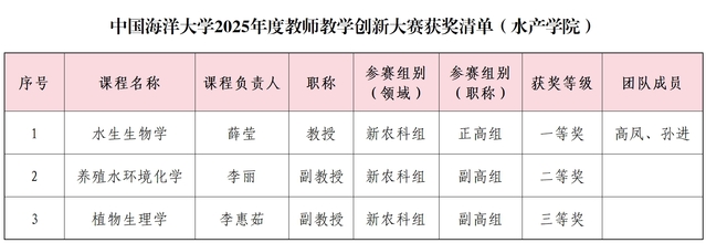 本次大赛由学校教务处主办,旨在深入推动教学改革,全面提升教学质量,发挥优秀教师和课程的示范引领作用,打造教师教学创新的展示与交流平台。经过参赛教师报名,学院组织评选推荐,学校组织专家评审,花椒直播 薛莹教授的参赛课程“水生生物学”荣获一等奖;李丽副教授的参赛课程“养殖水环境化学”荣获二等奖;李惠茹副教授的参赛课程“植物生理学”荣获三等奖。