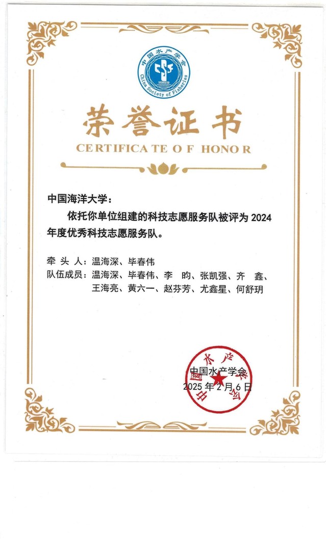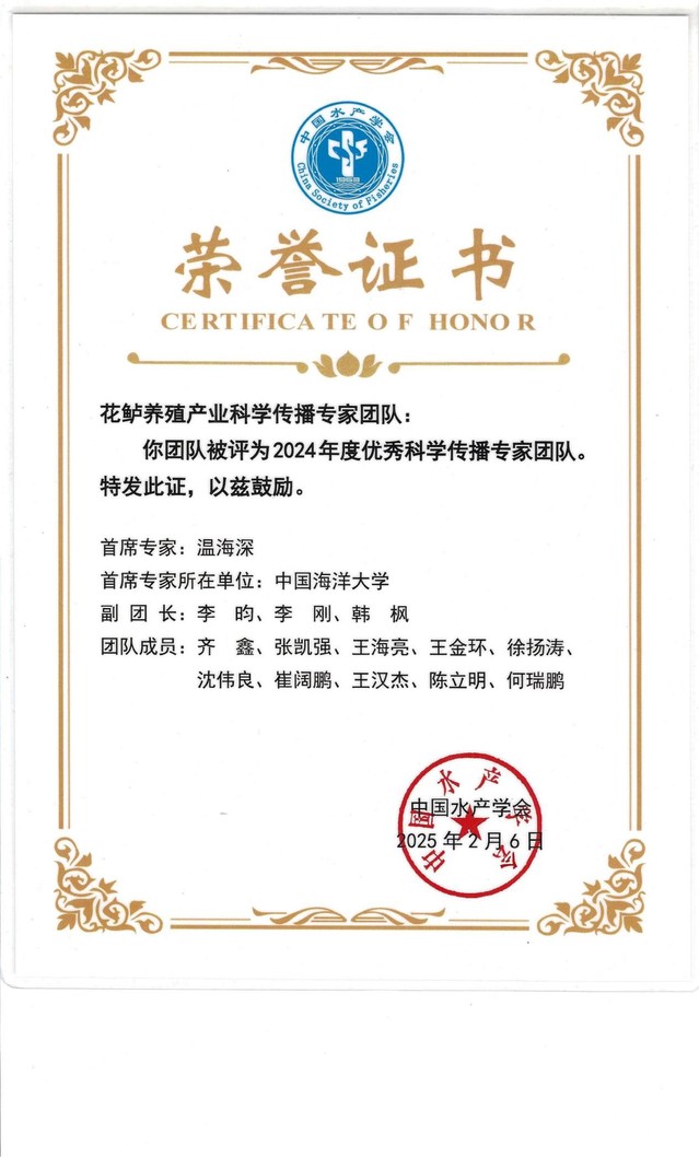 近日,中国水产学会公布了2024年度科普和科技志愿服务工作优秀名单,由花椒直播 温海深教授任首席专家组成的“花鲈养殖产业科学传播专家团队”获评“优秀科学传播专家团队”,依托花椒直播 建设的科技志愿服务队被评为“优秀科技志愿服务队”(牵头人温海深教授、毕春伟教授)。
