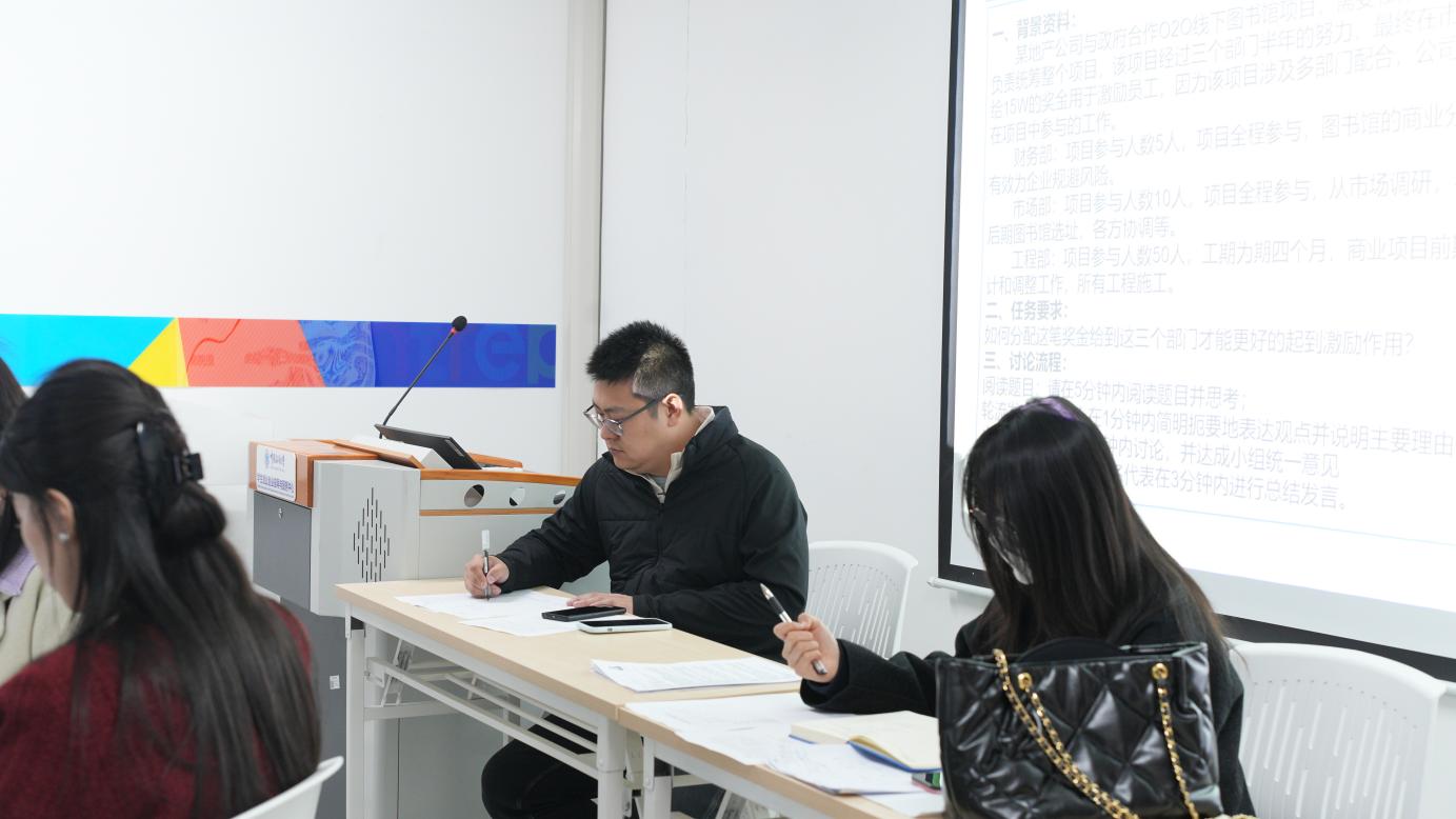 此次无领导小组模拟面试活动分为自由讨论、总结陈述、评委点评、现场答疑四个部分。参赛选手在不同校区被分为八个小组,各小组抽到题目后,进行50分钟的自由讨论,最后派出一名代表向考官做总结汇报。