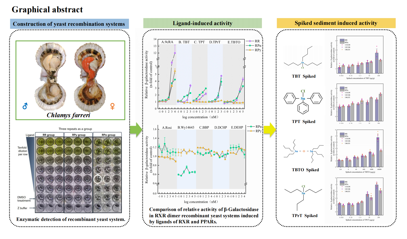 近日,研究室在内分泌干扰物(有机锡)对双壳贝类核受体(维甲酸X受体)干扰效应体外检测系统构建与应用方面取得新进展,相关研究成果以“Use of GAL4 factor-based yeast assay to quantify the effects of xenobiotics on RXR homodimer and RXR/PPAR heterodimer in scallop Chlamys farreri”为题发表在环境科学与生态学领域TOP期刊Science of the Total Environment (中科院2区,IF=10.753)上。