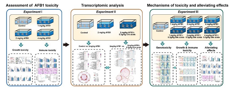 黄曲霉毒素B1(AflatoxinB1,AFB1)是饲料中目前检出率最高、具有强致癌性的霉菌毒素。AFB1污染已成为严重的公共卫生问题,不仅可造成养殖动物中毒死亡,而且可通过食物链对人类健康造成严重威胁。胆汁酸是脊椎动物肝脏合成的内源性“清洁剂”,在机体的毒素排出和毒性缓解过程中起着关键作用。凡纳滨对虾(Litopenaeus vannamei)是全球养殖规模最大的对虾种类,对AFB1高度易感,而且无法内源合成胆汁酸,目前关于AFB1在无脊椎动物体内的毒性机制与胆汁酸缓解作用尚不明确。