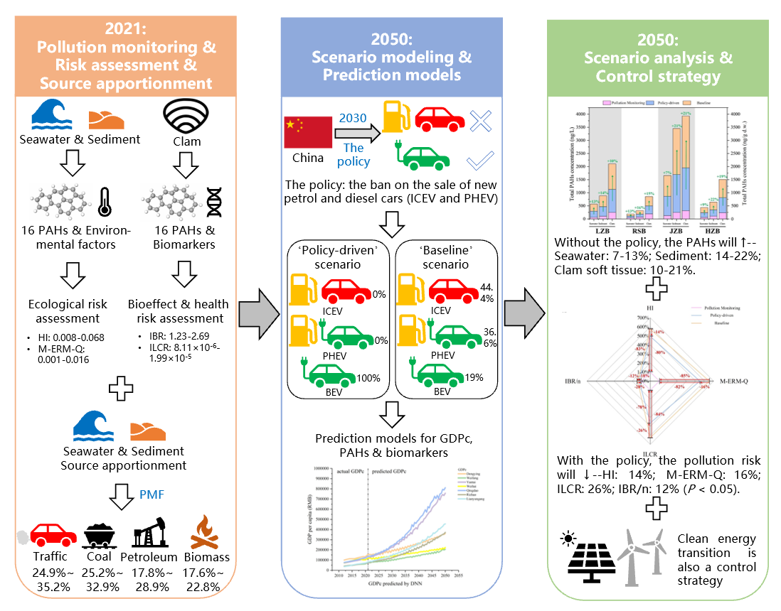 本研究基于对山东典型海湾PAHs的污染监测、风险评估和源解析,通过情景模拟和预测模型评估了燃油车禁售在中国海洋PAHs污染管控方面的效能。结果显示,2021年山东典型海湾PAHs主要来源于交通排放(24.9%-35.2%)、煤炭燃烧(25.2%-32.9%)、石油类源(17.2%-28.9%)和生物质燃烧(17.7%-22.8%),经预测2050年燃油车禁售相较于不禁售的污染风险值下降幅度为12%-26%,由此建立了一套海洋POPs未来污染的科学评估方法。然而,由于山东省是中国火力发电量最高的省份,而全球其他沿海地区发电能源消耗与此不同,因此燃油车禁售政策在海洋PAHs污染管控方面可能更有效,这方面尚需进一步研究。