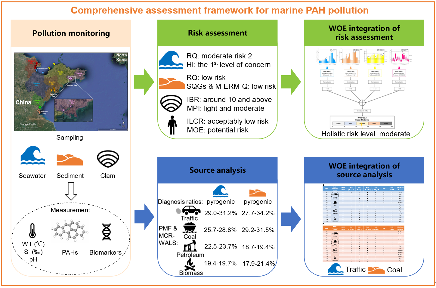 结果表明,山东典型海湾海水、沉积物PAHs分别为中等生态风险、无生态风险,菲律宾蛤仔综合生物标志物指数显示PAHs为中度污染水平,具有潜在的暴露风险和可接受的致癌风险,采用WOE模型整合生态风险、生物效应和健康风险分析显示,PAHs污染风险分级水平为“中等”,说明山东典型海湾PAHs污染存在潜在风险,亟需管控。PAHs受体模型溯源分析表明,典型海湾PAHs主要来源于交通排放源(海水29%,沉积物34.2%),煤炭燃烧源(海水28.8%,沉积物29.2%),石油类源(海水22.5%,沉积物18.7%)和生物质燃烧源(海水分析结果17.9%),而社会经济溯源分别为交通排放源和煤炭燃烧源;通过WOE模型整合源解析和社会经济指标,表明海水PAHs主要来源于交通排放的可能性高,沉积物PAHs主要来源于煤炭燃烧的可能性为中等。综合考虑所有环境介质(海水、沉积物、海洋生物)和人类健康(食品安全)因素,通过融入生物监测信息,整合风险评估和溯源分析过程,首次构建了海洋POPs污染综合评估框架。
