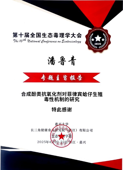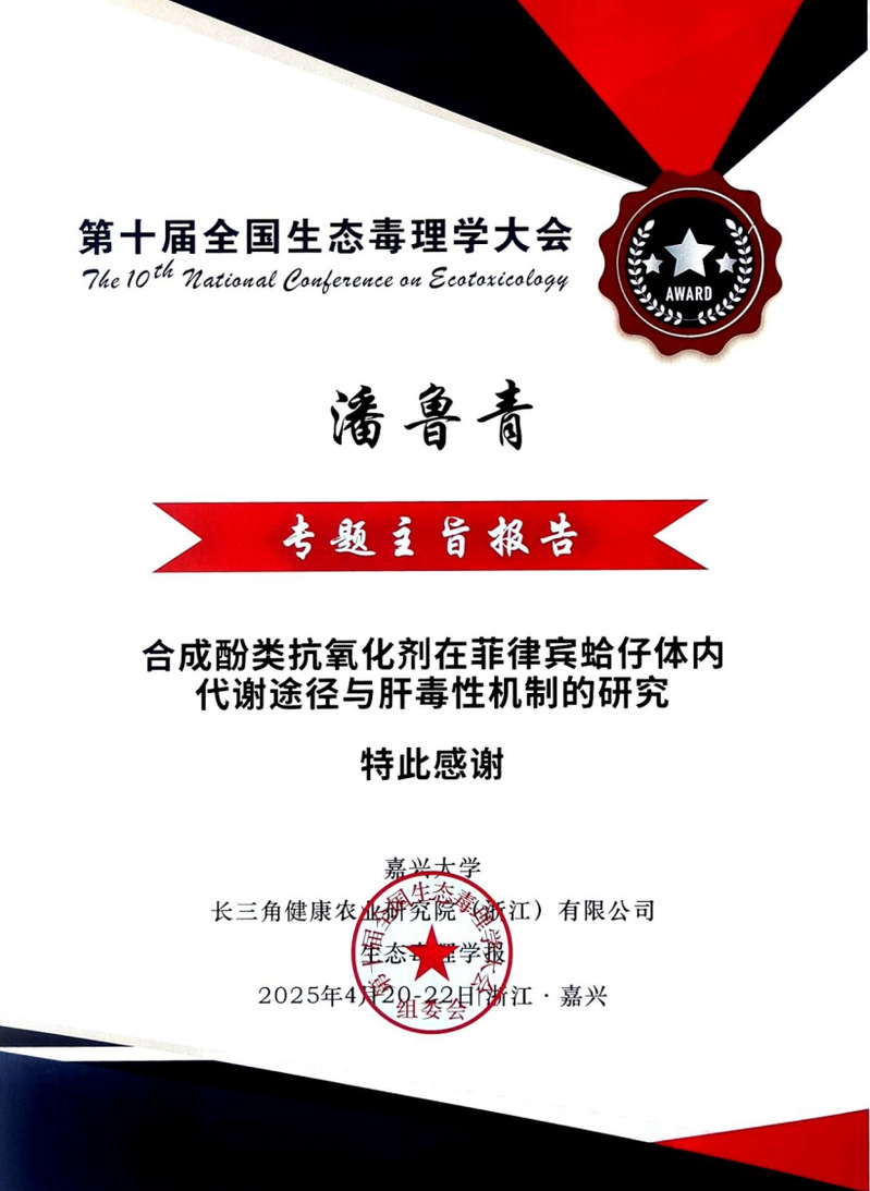 2025420-22日“第十届全国生态毒理学大会”在浙江省嘉兴市隆重召开。本次盛会由嘉兴大学、长三角健康农业研究院(浙江)有限公司与生态毒理学报联合主办,汇聚了国内生态毒理学、环境毒理学、卫生毒理学等领域的权威专家、学者和青年科研工作者,围绕化学物质环境行为、毒理效应机制、生态健康风险评估等前沿议题展开深入研讨。研究室潘鲁青教授和苗晶晶副教授受邀在会议上作学术报告。