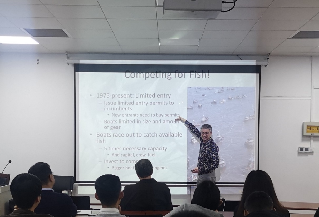 Anderson教授用大量案例浅显易懂地介绍了TAC、渔获量共享制度、个体可转让配额、禁渔期、禁渔区等渔业管理中调控捕捞努力量的方法,以实现渔业资源可持续利用,指出维持目标渔业种群可持续利用需要严格限制捕捞死亡率,但也需要采取额外措施来产生良好的经济效益。与会师生就多鱼种TAC管理、中国限额捕捞试点等问题同Christopher M. Anderson教授展开了热烈的交流和讨论。