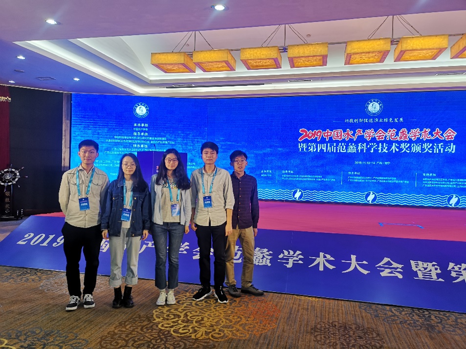 2019年11月13日至14日,研究室5名硕士研究生赴广西南宁参加了为期2天的中国水产学会范蠡学术大会。此次会议是我国水产领域级别最高的综合性学术盛会,是水产科技工作者学术交流和思想碰撞的重要平台。本次大会以“科技创新促进渔业绿色发展”为主题,包括1个主会场和8个分会场。会议期间,我校学生认真听取了多名专家学者的主旨报告,如农业农村部渔业渔政管理局局长张显良的《加快推进渔业高质量发展》、中国水产学会理事长王清印的《2016-2019水产学学科发展研究报告》等;主要听取了“渔业资源与生态养护”分会场中其他院校师生的报告,如长江水产研究所危起伟研究员的《长江渔业资源与环境专项调查进展:鱼类种类与资源量现状》。通过本次会议,我校学生增长了专业知识,学习了前沿理论,开阔了研究视野。同时,我校5名研究生均在“渔业资源与生态养护” 分会场进行了口头汇报,展示了我校研究成果并与其他科研院校的同学们积极互动,促进了不同院校、不同科研单位师生之间的交流。