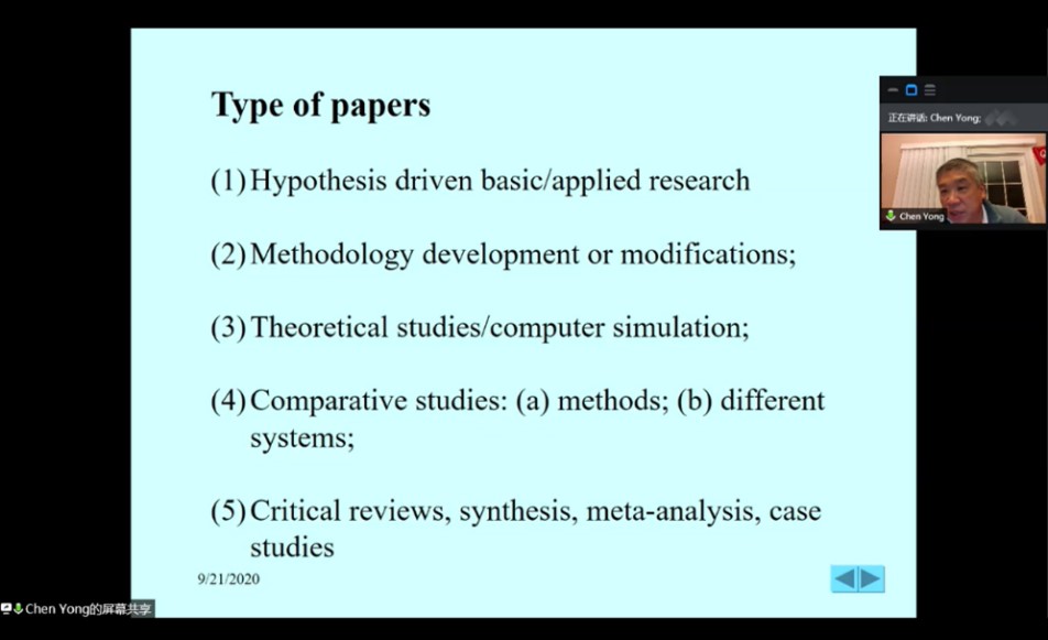 2020年9月22日上午,花椒直播 渔业生态系统监测与评估实验室客座教授陈勇,应邀为实验室师生进行了题为“Preparing, writing, and publishing a scientific paper in fisheries”的学术报告。陈勇教授从论文发表流程、如何为国际期刊撰写论文、提交论文后的注意事项三个方面进行了详细讲解。实验室研究生就如何取好论文标题、怎样结合中国实际渔业情况撰写高质量论文等话题同陈勇教授展开了热烈的交流和讨论。通过本次学术讲座,实验室研究生学习了论文写作知识,拓展了国际学术视野,为今后撰写高质量学术论文奠定了坚实的基础。