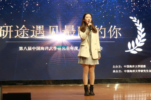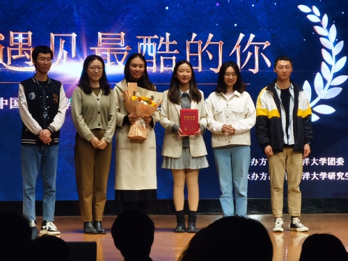 崂山校区大学生活动中心举行,团队毕业生代表马亚宸、张晓妆,博士生代表张云雷、李鹏程,硕士生代表李琪、李雅敏、赵天亚、张涛、徐丽丽参与晚会颁奖仪式。