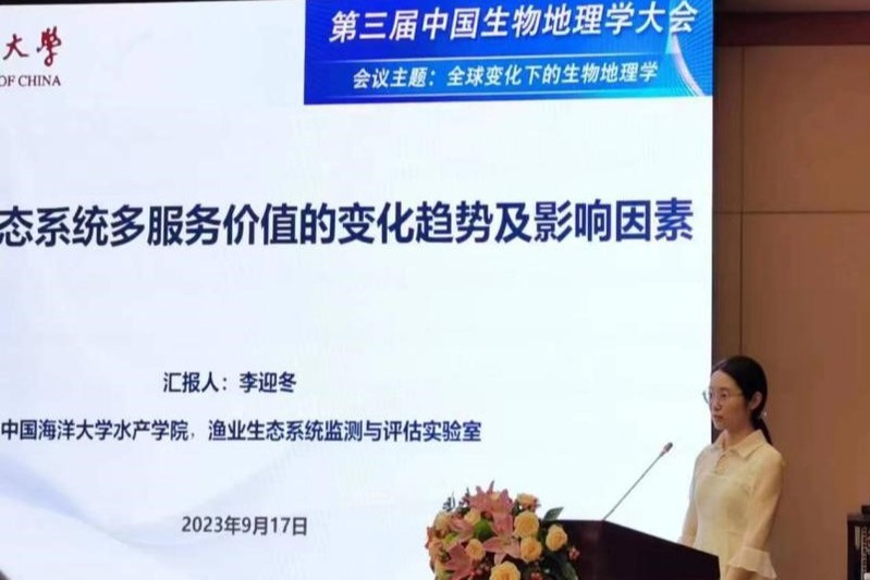 李迎冬做了题为《海洋渔业生态系统多服务价值的变化趋势及影响因素》的口头汇报。聚焦于不同时空尺度下渔业生态系统的服务价值,评估其变化趋势与影响因素,探究生物多样性、栖息地变化、捕捞等自然和人为因素对生态系统服务功能的作用机制。