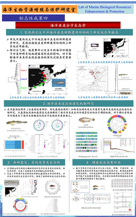 4. 海洋鱼类分子生态学:通过分子生物技术手段结合传统的形态学研究深入开展海洋鱼类的群体进化研究以及保护遗传学的相关研究,探讨海洋鱼类系统地理格局形成的影响因素以及在更新世冰期气候变迁的影响下西北太平地区洋海洋鱼类的进化机制。
