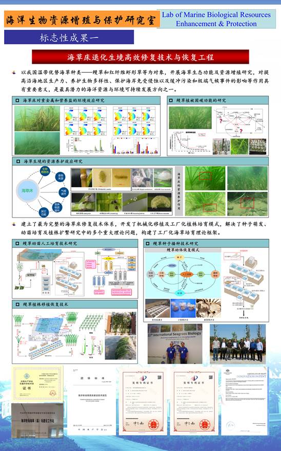 1. 在我国温带海草床退化生境恢复技术和生态工程方面,开展了大量基于自然恢复和工程修复相结合的海草床保护修复实践,突破了海草床生态系统恢复关键技术,研制了高效的海草机械辅助增殖装置和设备,推动我国海草床的生态修复进入集约高效的2.0时代。主导开展了我国首次海草床规模化修复,支撑了我国多个海草生态修复工程,在河北唐山、山东威海、烟台和东营等海域修复养护海草床超过20000亩,取得了显著的社会效益和生态效益,《央视新闻》《中国新闻社东西问》《CHINA DAILY》《山东卫视》《香港文汇报》《青岛日报》等十余家主流媒体相继报道了团队在海草床修复保护方面取得的成效,并获得第十届“母亲河奖”绿色项目奖(全国高校项目仅有8个)和全国青少年零碳科技大展领航项目(全国共15项),为海洋生态文明建设、海洋强国和乡村振兴等国家重大战略做出了较突出的贡献,在业内产生了显著影响。