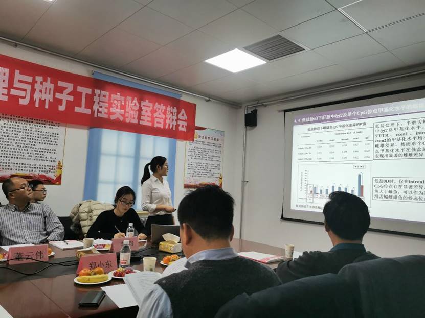 2013级硕士,2015年进入硕博连读阶段,2017年赴美国马里兰大学联合培养,硕博期间表现优异,成果丰硕。此次报告主要讲述了低盐对半滑舌鳎生长性能的影响及其表观遗传适应机制的相关内容和美国留学期间所做的关于斑马鱼的研究。报告详细介绍了低盐胁迫对半滑舌鳎肝脏组织结构的影响、低盐胁迫下半滑舌鳎肝脏IGF1和IGF2蛋白定位和基因表达的研究、低盐胁迫对半滑舌鳎肝脏IGF1和IGF2甲基化水平的影响、低盐胁迫下半滑舌鳎不同组织全基因组甲基化状态MSAP分析。聂品教授在内的答辩委员会对李思平博士的汇报给予了很高的评价,就汇报中提到的关于IGF基因、甲基化、蛋白结构及实验过程、数据等方面的专业问题作了深入探讨。报告内容生动丰富,使大家获益匪浅。 答辩委员会由聂品教授担任主席,委员有李超教授、柳学周研究员、刘世凯教授、董云伟教授、郑小东教授、高勤峰教授,李昀副教授担任秘书。温海深教授等专家也出席会议。