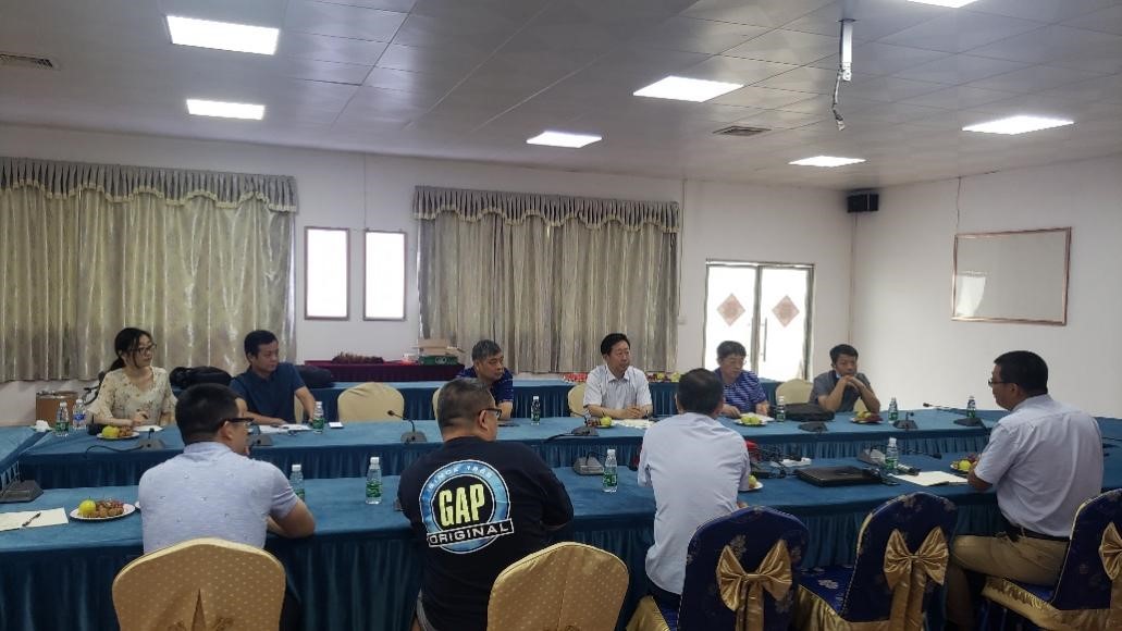与会人员合影 调研小组在粤顺公司进行了现场考察和座谈,会上,温教授对粤顺公司长期以来的支持表示感谢,并简要介绍了调研小组成员。接下来,张总对一年来花鲈养殖情况做了介绍,在苗种方面,今年花鲈苗种质量显著下降,病毒病增加,成活率降低,导致公司花鲈养殖规模缩减,市场急需体质优、无病毒的鱼苗;在养殖成本方面,公司经过多年探索,塘租、人工、水电、饲料成本基本固定,但是唯独苗种成本不可控,波动较大;病毒方面,花鲈虹彩病毒、弹状病毒、神经坏死病毒较为普遍,经过检测,部分病毒从卵就开始携带,此外,枝角类、桡足类饵料中普遍携带病毒;在尾水处理方面,公司将对进水、排水分开,施工设计已经完成,等待开工。