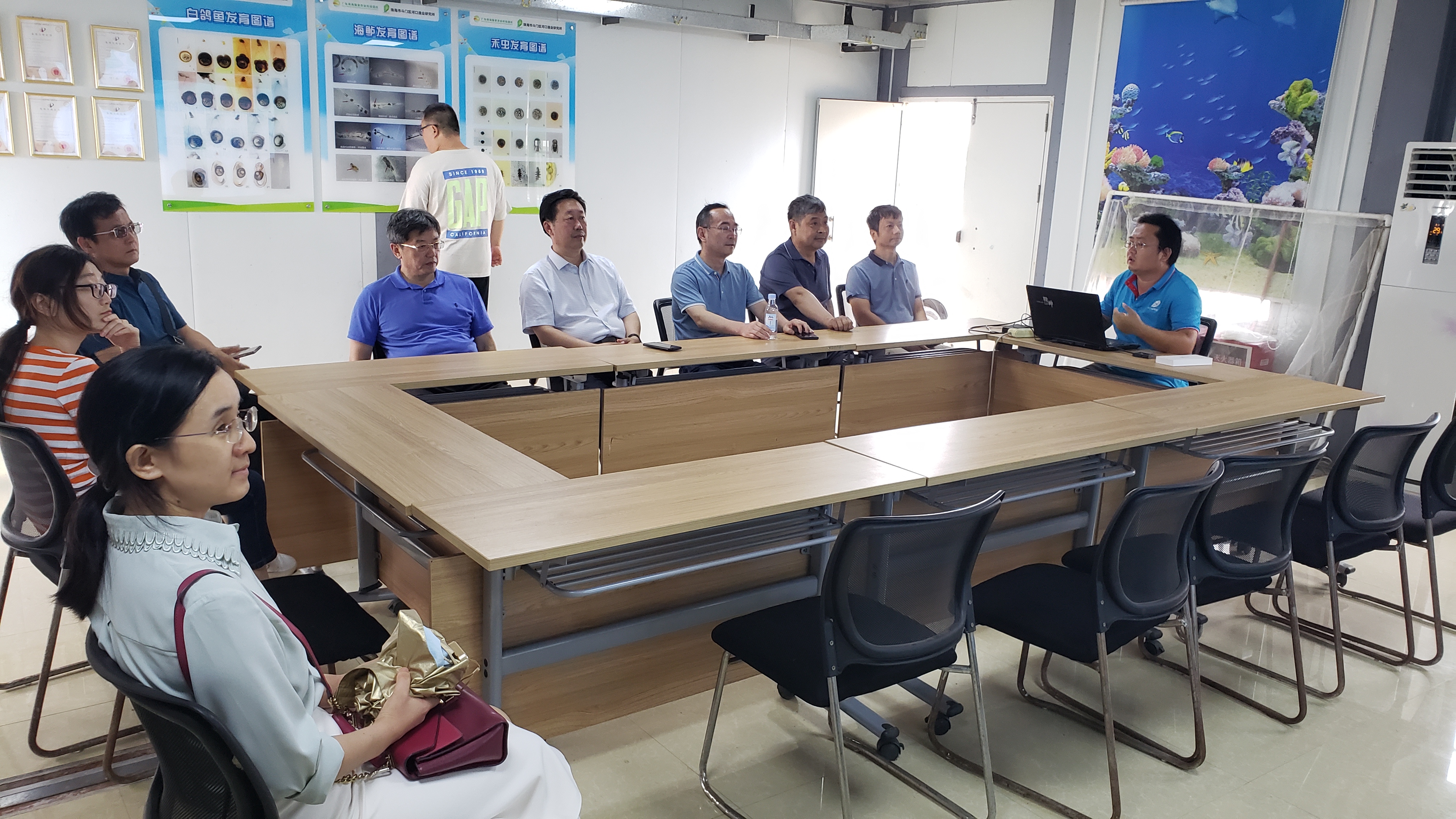 温教授,带领海鲈调研小组到珠海市斗门区河口渔业研究所(研究所)调研,研究所所长崔阔鹏全程陪同。调研小组成员由中国科学院海洋研究所李军研究员、花椒直播