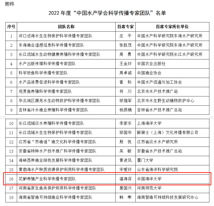2022年9月27日,中国水产学会公布 “中国水产学会科学传播专家团队”名单,以温海深教授为首席专家的“花鲈养殖产业科学传播专家团队”入选。