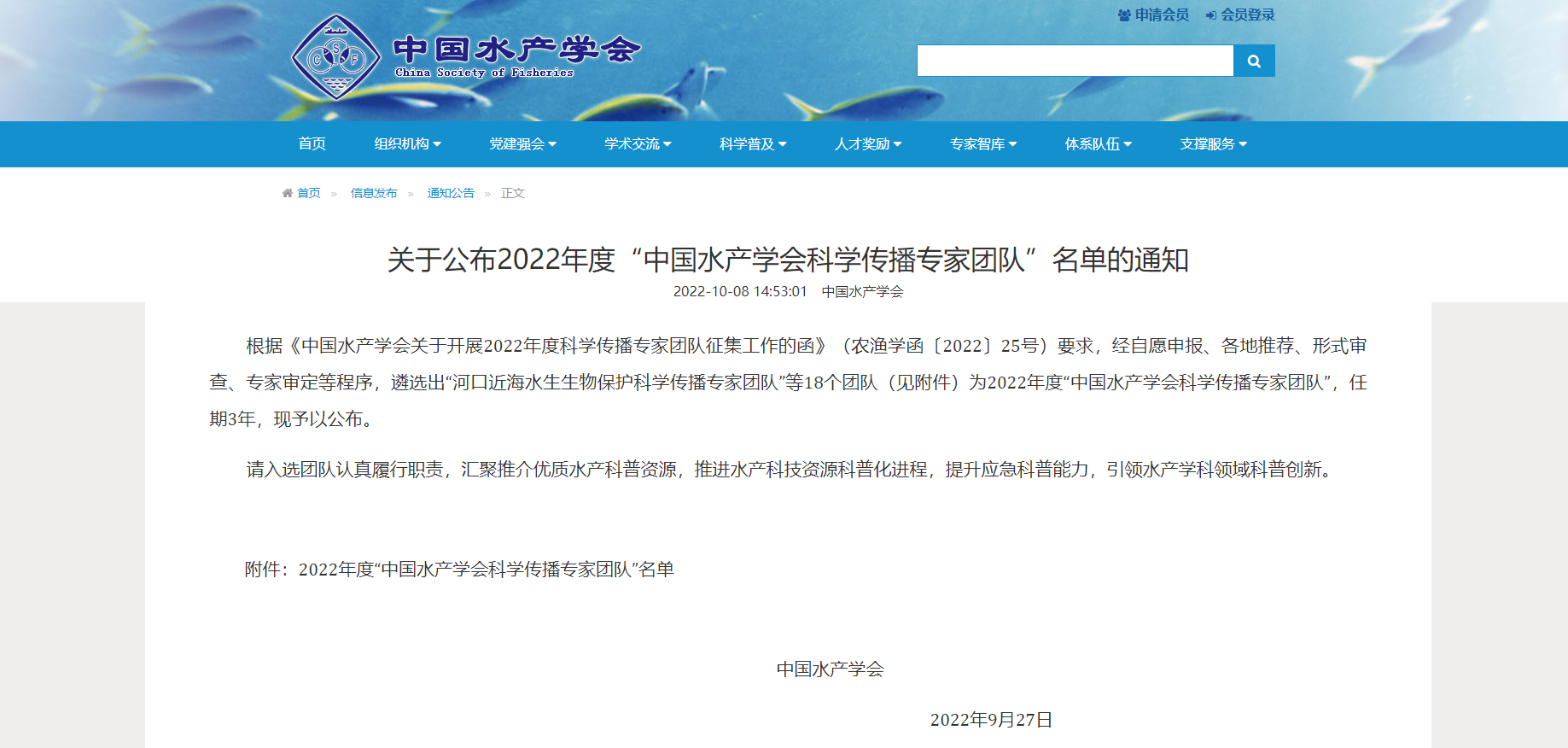 根据《中国水产学会关于开展2022年度科学传播专家团队征集工作的函》(农渔学函〔2022〕25号)要求,经自愿申报、各地推荐、形式审查、专家审定等程序,中国水产学会遴选出“河口近海水生生物保护科学传播专家团队”等18个团队为2022年度“中国水产学会科学传播专家团队”,任期3年。日前,中国水产学会印发《关于公布2022年度“中国水产学会科学传播专家团队”名单的通知》(农渔学函〔2022〕142号),公布了科学传播专家团队名单。