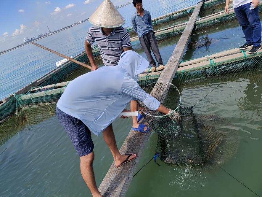 实验室一行前往达广西水产科学研究院北海基地养殖车间、养殖池塘和网箱养殖区进行考察,参观了基地养殖设施、鱼类养殖情况。基地车间主要用于多种石斑鱼品种的苗种培育、养成;室外池塘主要用于石斑鱼种类与南美白对虾的混合养殖;网箱主要用于石斑鱼等鱼类的规模化养殖。实验室老师一行还就北海及周边地区海鲈养殖情况进行了调研,并着重调研了本地海鲈的生长、抗病、耐高温等性能。调研过程中,双方就北部湾区域海鲈繁殖、培育、推广事宜进行了沟通,并达成了初步合作意向。