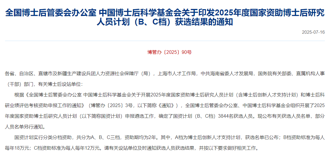 近日发布《全国博士后管委会办公室 中国博士后科学基金会关于印发2025年度国家资助博士后研究人员计划(BC档)获选结果的通知》,实验室博士后孙冬磊入选本次国家资助博士后研究人员计划C档。全国共3844人获得国资计划(BC档),水产一级学科获选13B3C10人)