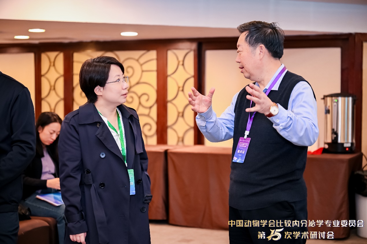 温海深教授与参会专家亲切交流 30日上午,温海深主持第二场专题报告,并与专家进行交流。30日下午,大会设置研究生学术报告专场,实验室3位研究生作口头报告,展示了课题组在鱼类内分泌与生殖调控方面的最新进展。其中,博士生左陈鹏作题为《生长分化因子9和激活素A提高日本鳗鲡卵子质量的功能及机制研究》的报告;博士生杨晶汇报了《RNAi介导的肌抑素敲低可改善花鲈肌肉质量》的研究成果;硕士生杨欣琳则以《卵胎生硬骨鱼许氏平鲉妊娠维持机制解析》为题介绍了相关工作。三位同学报告内容充实、思路清晰,展现了实验室青年学者良好的科研素养。