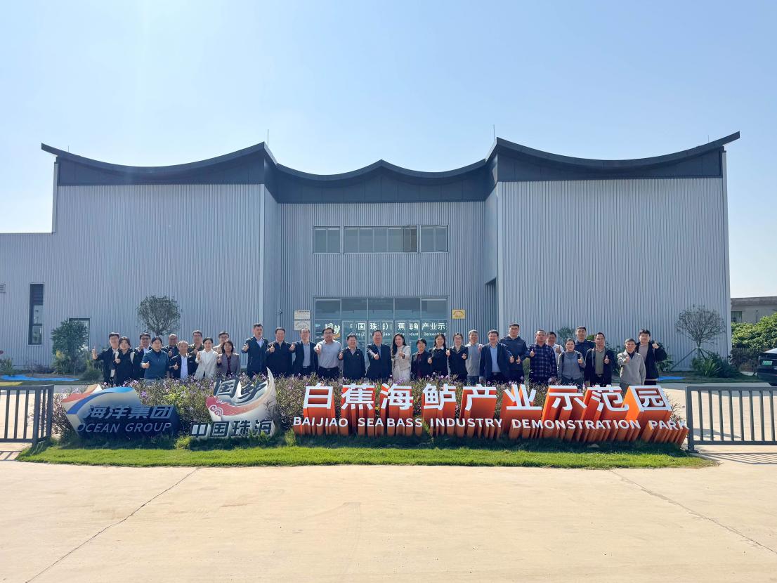 与会人员合影 会议开始,珠海市农业集团有限公司副总经理林卿叶介绍了白蕉海鲈公司成立以来取得的成绩。珠海市海洋发展局副局长苏跃朋在讲话中高度肯定"十四五"期间海鲈产业的跨越式发展,并从种质优化、标准化养殖、尾水循环治理、陆海接力养殖模式探索等方面分析了珠海花鲈产业面临的问题,希望携手各位专家推动海鲈产业在'十五五'实现质的飞跃。