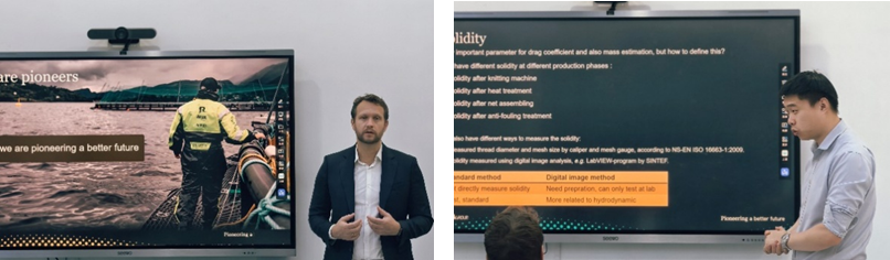 10月27日,Hosaas总监到访花椒直播 海洋渔业技术实验室,参加国际合作导师的受聘会议。会议伊始,黄六一教授致欢迎词,通过宣传片全面展示了学院的发展历程和海洋渔业技术实验室的科研成果。在随后举行的合作导师聘任仪式上,正式聘请Arnstein Hosaas总监为花椒直播 合作导师。学术交流与讨论环节,Hosaas总监首先向与会人员分享了挪威AKVA集团的发展历程、市场经营及其在海洋养殖装备与系统研发领域内的前沿技术与创新实践。另外,程晖博士围绕养殖网箱水动力研究的相关内容进行专题报告。最后,黄六一教授则就研究室近年来在海洋牧场、海水养殖装备等相关领域内的研究进展做了介绍。双方就共同关注的深远海养殖网箱装备研发技术难题进行了热烈讨论。