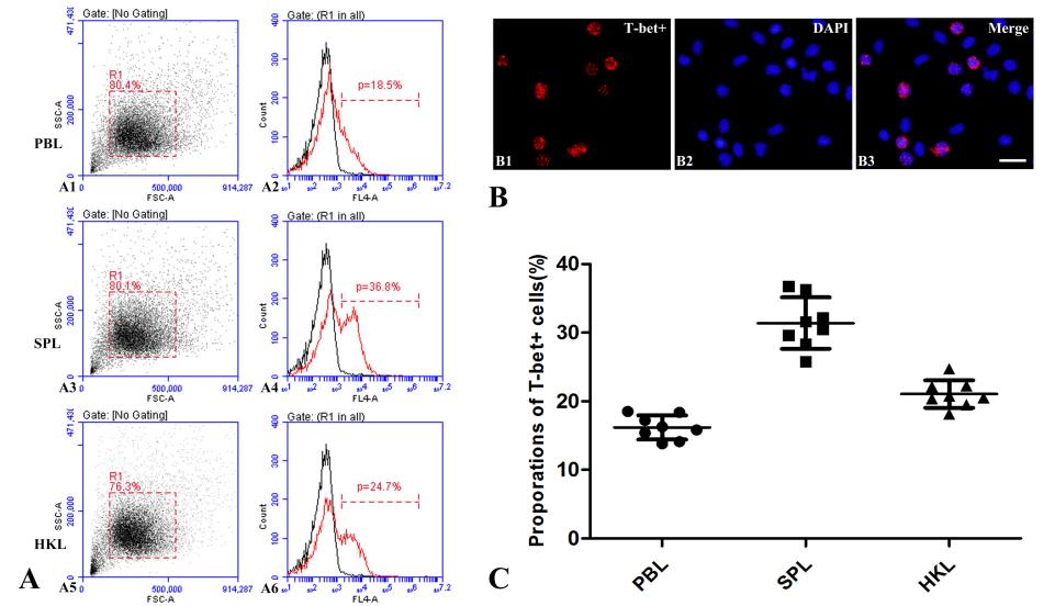 1.牙鲆T-bet+细胞在外周血,脾和头肾淋巴细胞中的含量