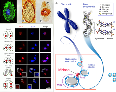 纤毛虫模式动物的表观遗传学研究:主要以模式纤毛虫四膜虫为材料,围绕以甲基化为主的表观遗传调控机制开展研究。研究包括组蛋白甲基化在复制-转录冲突调控中的功能和分子机制,DNA腺嘌呤甲基化(6mA)的调控机制和作用通路等。