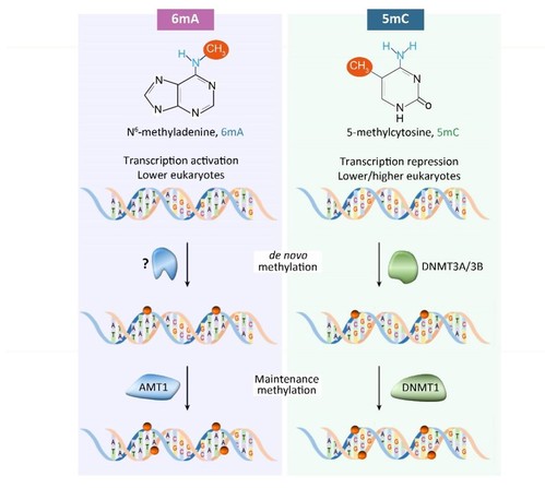 图2.真核生物两种DNA甲基化(6mA vs. 5mC)调控通路比较。