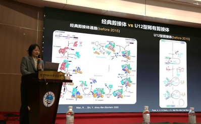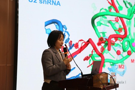 在本次报告中,万蕊雪研究员围绕关于RNA剪接的分子机理的研究,系统性地介绍了其本人及实验室前期的成果及未来的研究方向。RNA剪接在基因表达调控中起到重要作用,其本质是两步连续的转酯反应。由基因组DNA转录生成前体信使RNA的过程及由成熟信使RNA介导的翻译和修饰的过程和机制已被广泛地研究和报道,而其中间过程——即前体信使RNA如何剪接形成成熟信使RNA的具体分子机理此前尚不明确。因为剪接体的成分复杂、结构动态多变,且剪接过程分为多个步骤,使其具有相当大的研究难度。