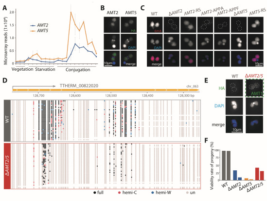 2. AMT2AMT5调控新大核中6mA的从头建立。(AAMT2AMT5在新大核发育时期高表达;(BAMT2AMT5定位在新大核;(CAMT2/AMT5敲除导致新大核6mA水平下降,野生型AMT2/AMT5回补可使新大核中6mA水平恢复,突变回补不能使6mA水平恢复;(DSMRT-CCS结果显示敲除株系中6mA位点数大量减少,甲基化水平显著下降;(E)敲除株系后代中AMT1蛋白水平相比野生型上调;(FAMT2/AMT5敲除导致后代存活率下降。