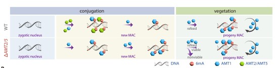 20255月,原生动物学研究室高珊教授课题组在Science Advances杂志发表题为Identification and characterization of the de novo methyltransferases for eukaryotic N6-methyladenine (6mA)的研究成果。这项研究以单细胞真核生物-嗜热四膜虫为材料,利用其接合生殖过程中无6mA的合子核发育为有6mA的子代新大核这一独特的时间窗口,鉴定了MT-A70家族蛋白AMT2AMT56mA从头甲基化酶,并揭示了两者在6mA从头建立及细胞正常发育中的关键作用。
