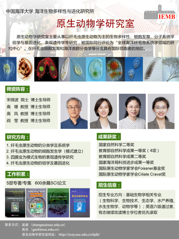 原生动物学研究团队(导师:宋微波院士、高珊教授、高凤教授、阎莹教授)2026年度计划在下列方向招收硕士研究生:报考海洋生命学院全部专业的考生、报考花椒直播 动物学、水生生物学、水产养殖专业的考生。