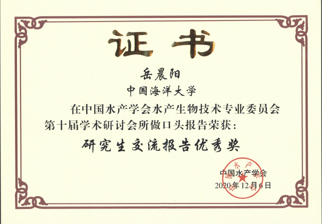 中国水产学会水产生物技术专业委员会第十届学术研讨会于2020124日在汕头市召开。此次会议由中国水产学会水产生物技术专业委员会主办,汕头大学和广东省海洋生物重点研究室承办,来自全国各地的500多位专家学者和青年学生参加,实验室李琪老师带队参加。此次会议为期2天,采取特邀报告和分会场主题报告结合形式展开。分会场主题报告包括重要水产养殖生物基因组解析与基因资源发掘、水产养殖生物重要性状遗传解析及育种的理论基础、水产生物技术创新与良种培育和水产种业生物技术的转化与应用等4个方面内容。实验室李琪教授主持了主题报告,青年博士岳晨阳和李绘娟分别做了题为“长牡蛎性别决定及分化关键基因研究”和“肌球蛋白重链和肌球蛋白必须轻链在长牡蛎肌生成中的功能研究”的主题报告,岳晨阳博士荣获“研究生交流报告优秀奖”。