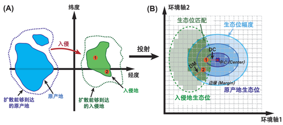 图2. 研究提出的在二维环境空间中量化多个生态位属性的示意图。(A)地理空间;(B)环境空间。