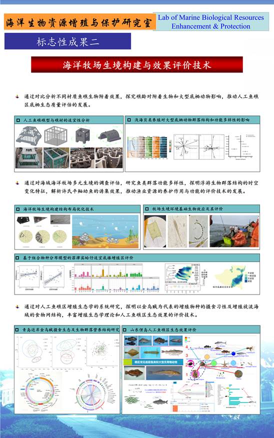 2. 在海洋牧场方面,从现代生态海洋牧场构建技术和效果评价技术着手,较系统地开展了现代生态海洋牧场构建理论与技术的研究与实践,系统调查与比较分析了我国北方多海区底栖大型海藻以及海藻附植动物等生物学和生态学特征,查明了适宜我国北方沿岸海域生长的大型海藻种类,并从礁型设计、礁材选取、鱼礁建植以及牧场区生态效果评价等方面系统研究了人工藻礁构建技术,研发了多款具有综合生态效益的人工藻(草)礁并实现了规模化的推广应用,推动了区域海洋资源环境养护和渔业可持续发展。主持编制水产行业标准1项(已报批),主持完成中国水产学会团体标准1项(已颁布),参与制定国家标准3项,其中1项已颁布, 2020年9月,团队获批农业农村部海洋牧场建设专家咨询委员会第一批科技团队全国工作站(全国仅9个),在海洋牧场海草床和海藻场构建技术及渔业资源增殖与养护技术等方面具有明显优势。