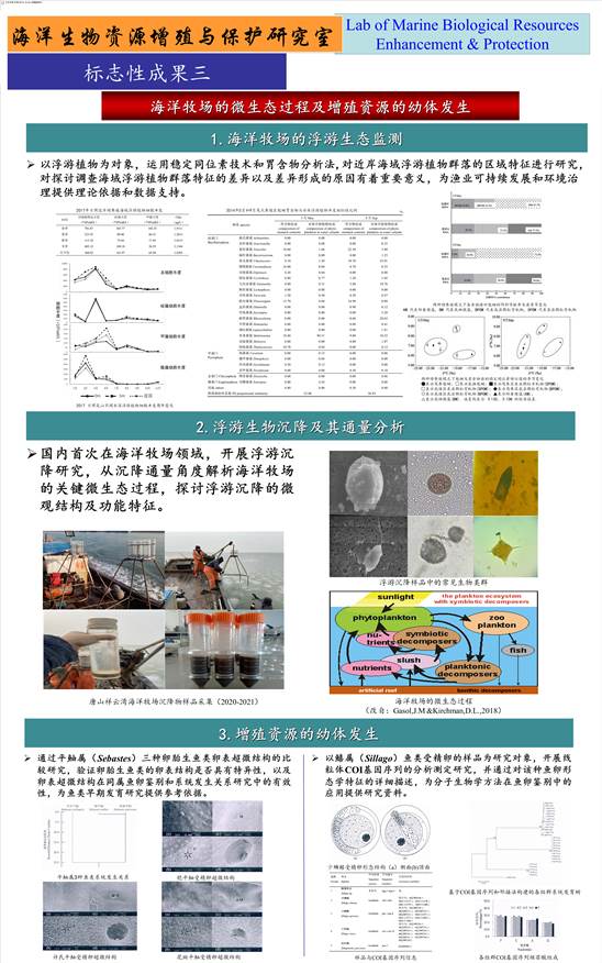 3.近岸增养殖海域的微生态过程及其功能特征:解析近岸增养殖生态系统以浮游生物为主的生态过程,探讨近岸增养殖微生态系统的结构和功能,以及增养殖资源的幼体发生特征,建立近岸增养殖海域的生态修复、资源增殖与养护、海洋牧场构建、生物灾害评估等微生态理论和功能提升策略。